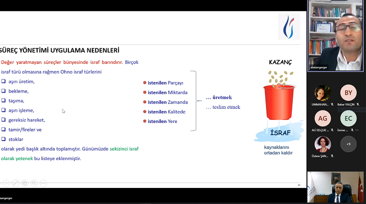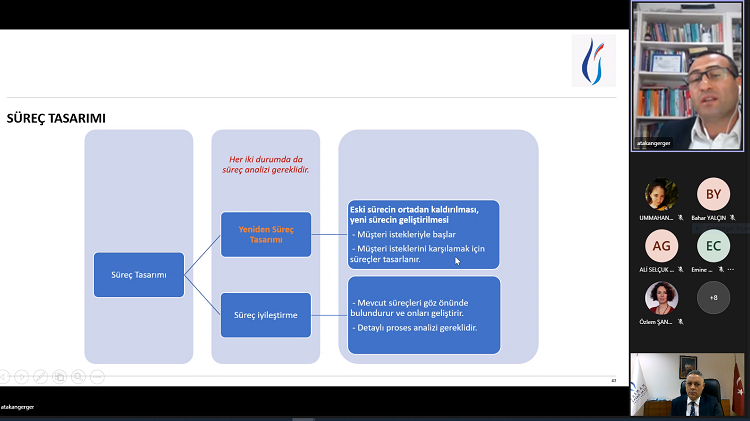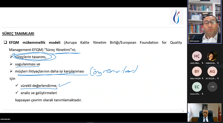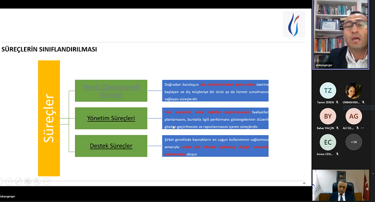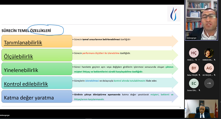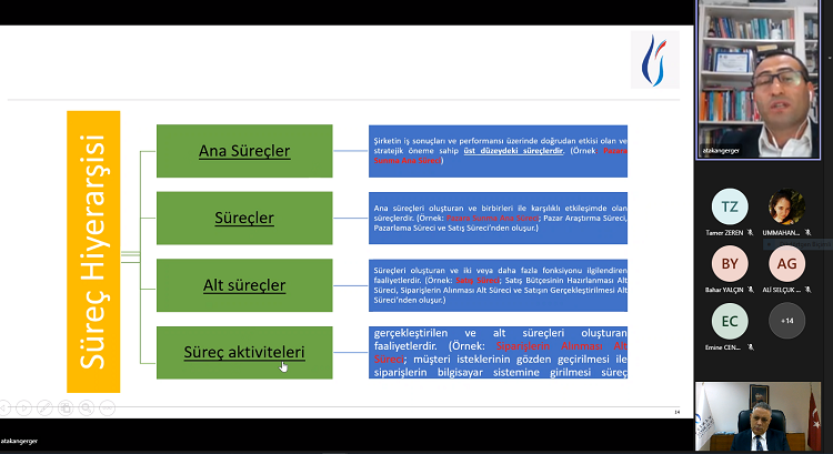 Kalite Koordinatörlüğü tarafından birim Stratejik Planlama ve Akreditasyon Komisyon üyelerine yönelik Süreç Yönetimi ve İyileştirilmesi eğitimi gerçekleştirildi. 20.12.2021 tarihinde 90 dakika süren online düzenlenen eğitimde Dr. Atakan Gerger süreç yönetiminin temel öğeleri olan süreçlerin belirlenmesi, tanımlanması, süreçlerin performanslarının ölçülmesi, kalite yönetim sisteminde süreç yönetiminin yeri, süreç sınıflandırması ve süreç hiyerarşisi, süreç analiz edilmesi ve iyileştirilmesi konusunda bilgiler aktardı.